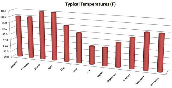 French Polynesia has a warm and humid sub-tropical climate. Air and sea temperatures range from 24C to 32C. Eastern trade winds blow all year long and severe weather is quite rare.